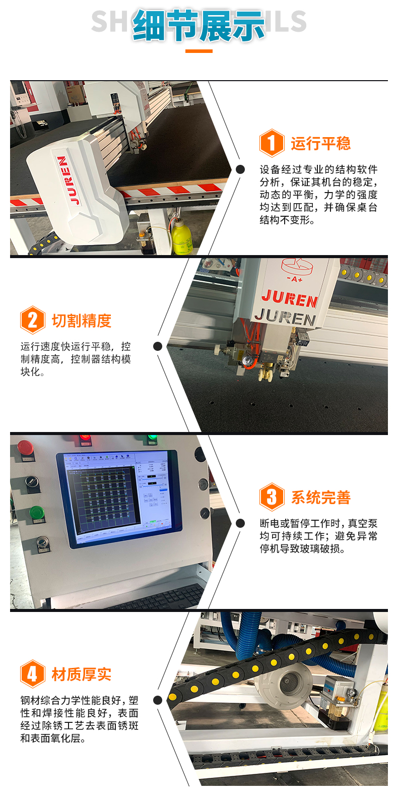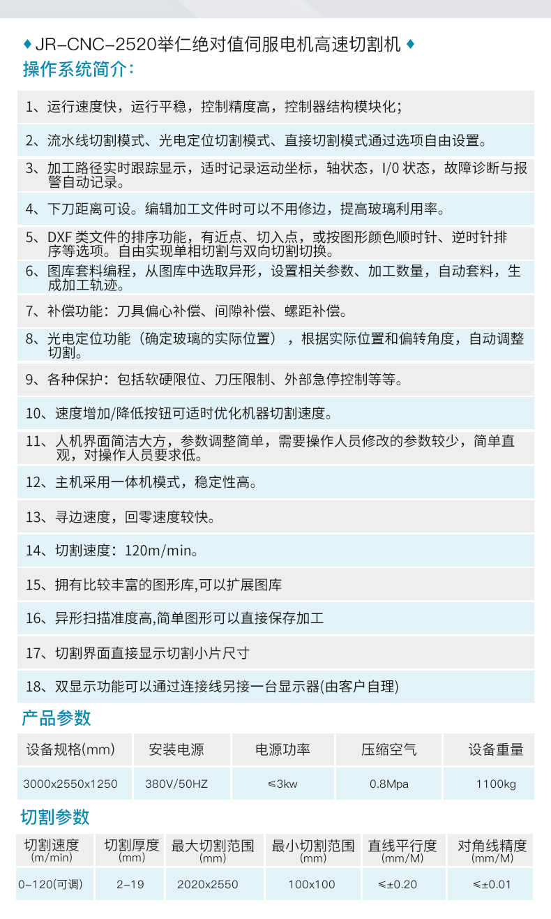 操作系統簡介:l 、運行速度快,運行平穩,控制精度高,控制器結構模塊化; 2 、流水線切割模式、光電定位切割模式、直接切割模式通過選項自由設置。 3 、加工路徑實時跟蹤顯示,警自動記錄。適時記錄運動坐標,軸狀態, ! / 0 狀態,故障診斷與報 4 、下刀距離可設。編輯加工文件時可以不用修邊,提高玻璃利用率。 5 、 OX 「類文件的排序功能,有近點、切入點,或按圖形顏色順時針、逆時針排序等選項。自由實現單相切割與雙向切割切換。 6 、圖庫套料編程,從圖庫中選取異形,設置相關參數、加工數量,自動套料,生成加工軌跡。了、補償功能:刀具偏心補償、間隙補償、螺距補償。 8 、光電定位功能(確定玻璃的實際位置)切割。根據實際位置和偏轉角度,自動調整 9 、各種保護:包括軟硬限位、刀壓限制、外部急停控制等等。、速度增加/降低按鈕可適時優化機器切割速度。、人機界面簡潔大方,參數調整簡單,需要操作人員修改的參數較少,簡單直觀,對操作人員要求低。、主機采用一體機模式,穩定性高