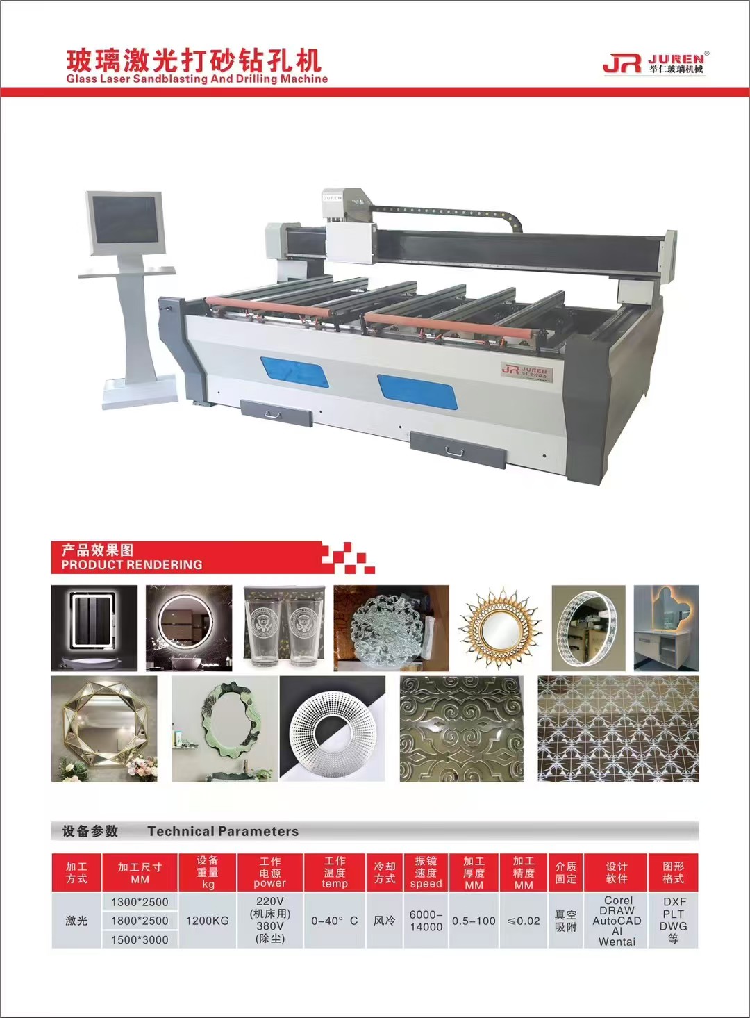 產品特點 精準可控激光束聚焦性強,可實現微米級雕刻,圖案/文字邊緣光滑無毛刺,支持復雜圖形、漸變效果定制。超高精度無損傷采用皮秒/飛秒超快激光,光斑直徑僅5μm,最小孔徑達20μm,精度誤差3μm;孔壁粗糙度Ra<0.5μm,崩邊可控制在5μm內,良率超99%,且熱影響區極小,不產生微裂紋。孔型適配性強支持圓孔、方孔、異形孔等多種孔型,還能加工錐度孔、盲孔及深徑比50:1的微孔,適配不同行業的定制化需求。多光束并行技術讓加工速度達3000孔/分鐘,可24小時連續工作;能兼容0.1mm超薄到20mm加厚玻璃,還適配藍寶石等硬脆材料高效環保無粉塵、無耗材(無需砂料),加工過程無噪音,相比傳統噴砂效率提升3-5倍,且不損傷玻璃基材。靈活適配兼容平面、曲面玻璃,支持不同厚度(1-20mm)、材質(普通玻璃、鋼化玻璃、藝術玻璃)加工,可批量生產也可單件定制。智能便捷搭載數控系統,支持CAD/CORELDRAW等格式導入,操作簡單,一鍵啟動,還可聯動自動化生產線。持久耐用激光頭壽命長(10萬小時),設備穩定性強,維護成本低,打砂效果耐摩擦、不易褪色。